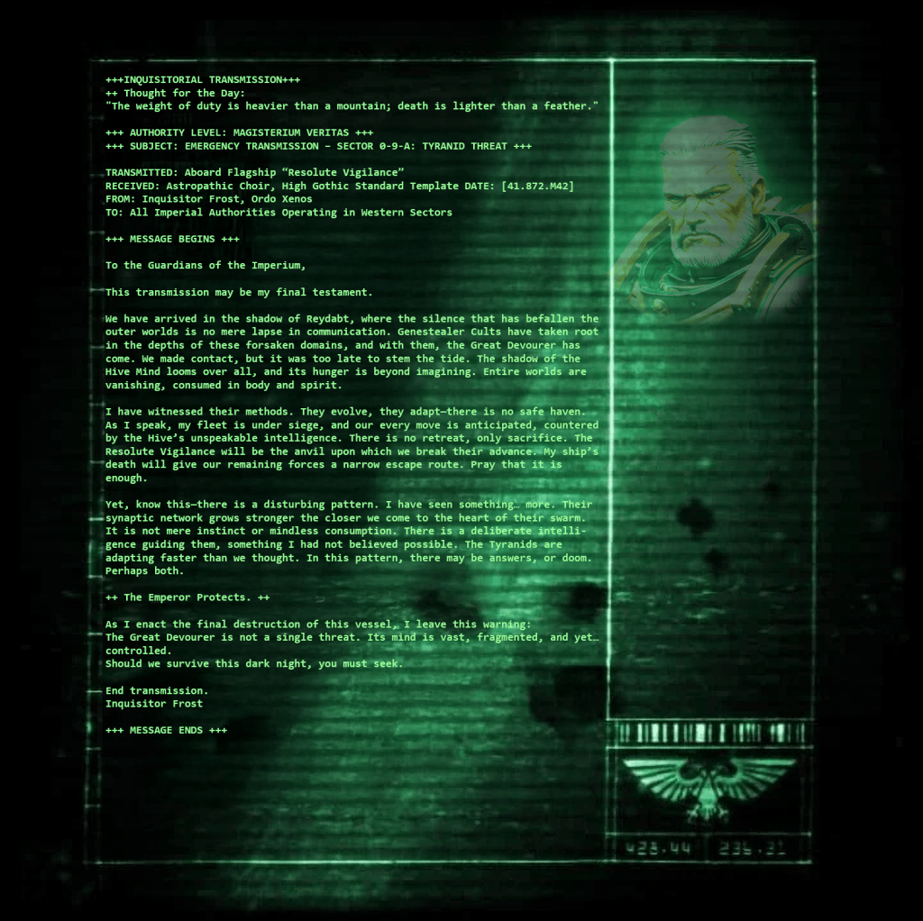 Inquisitor Frost’s final encrypted message hints at a web of conspiracy within the Imperium. Uncover the truth behind the cryptic message and decide what action to take!